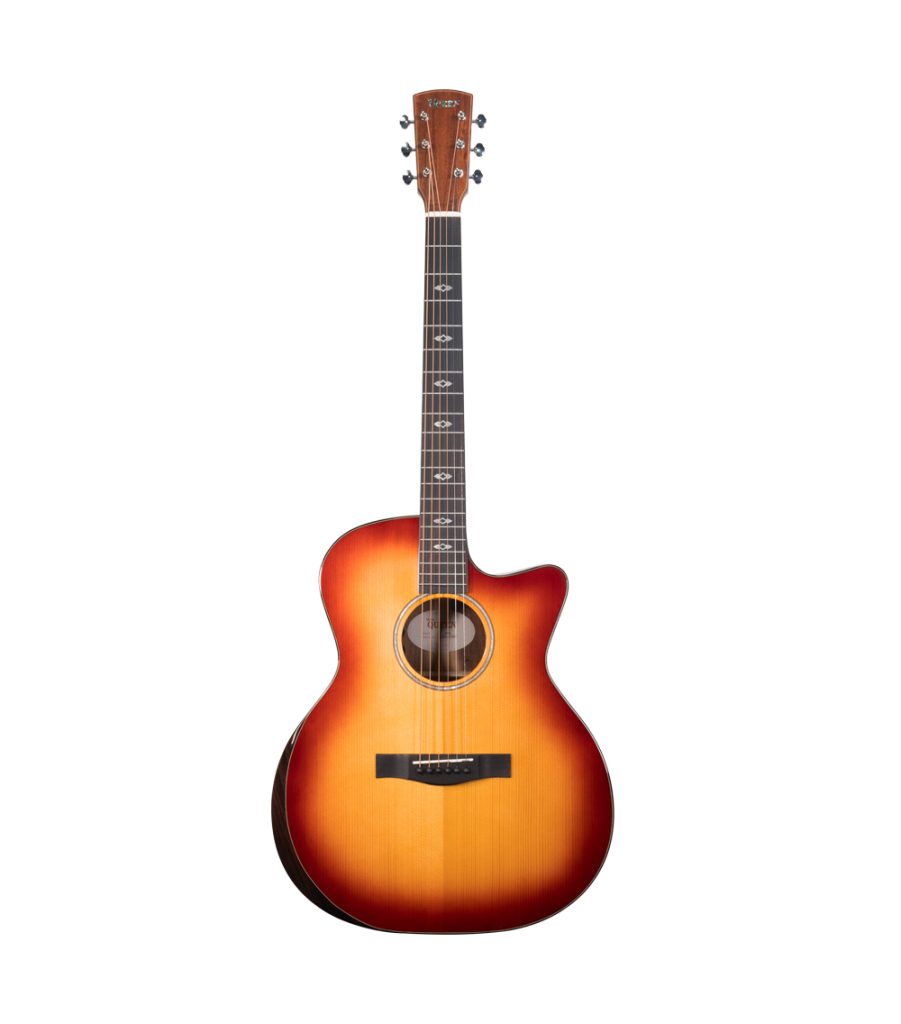 - Top (לוח עליון): עץ ספרוס מלא – אחד העצים המבוקשים בעולם לגיטרות אקוסטיות, בזכות יכולת הדינמיקה שלו והבהירות הנקייה שהוא מעניק לכל פריטה ונגיעה.