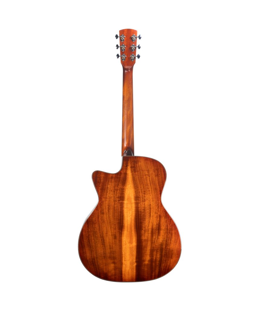 - Back & Sides (גב וצדדים): עץ קואה מלא – עץ אקזוטי ייחודי שמקורו בהוואי, עם צליל מחמם, אוריינטלי ומעט מסתורי. ככל שהגיטרה מנוגנת יותר – כך הקואה “נפתח”, משתבח ומקבל צבע טונאלי עשיר עוד יותר עם השנים.